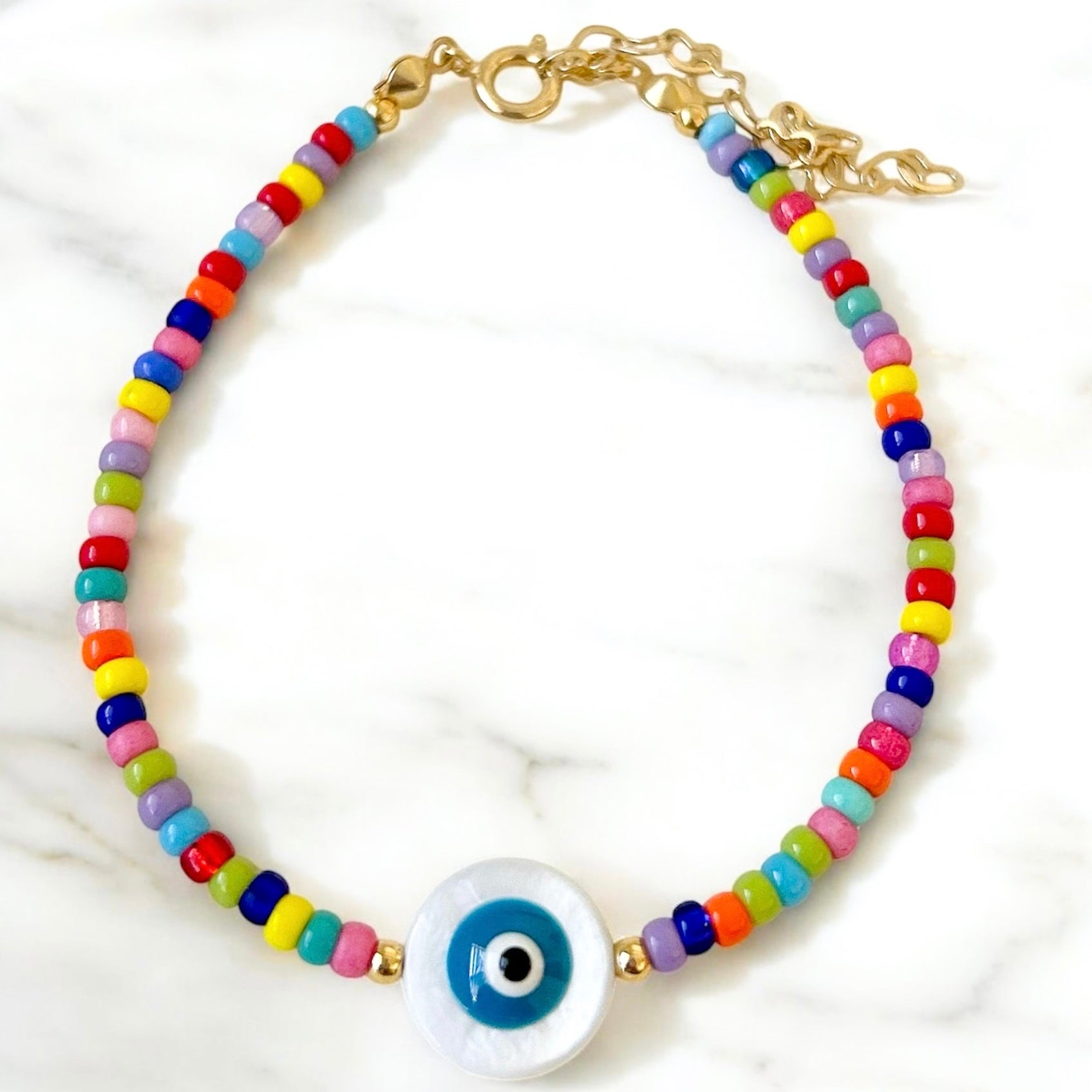 Natural shell evil eye + multicolor beads adjustable Bracelet