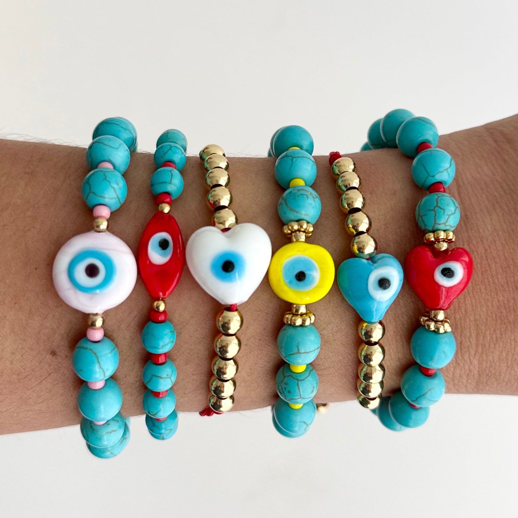 A bold and meaningful handmade bracelet featuring deep blue beads, vibrant red seed beads, and a red crystal evil eye charm for protection and intention. Finished with 18K gold-filled clasp and extender chain for a touch of elegance and durability.
