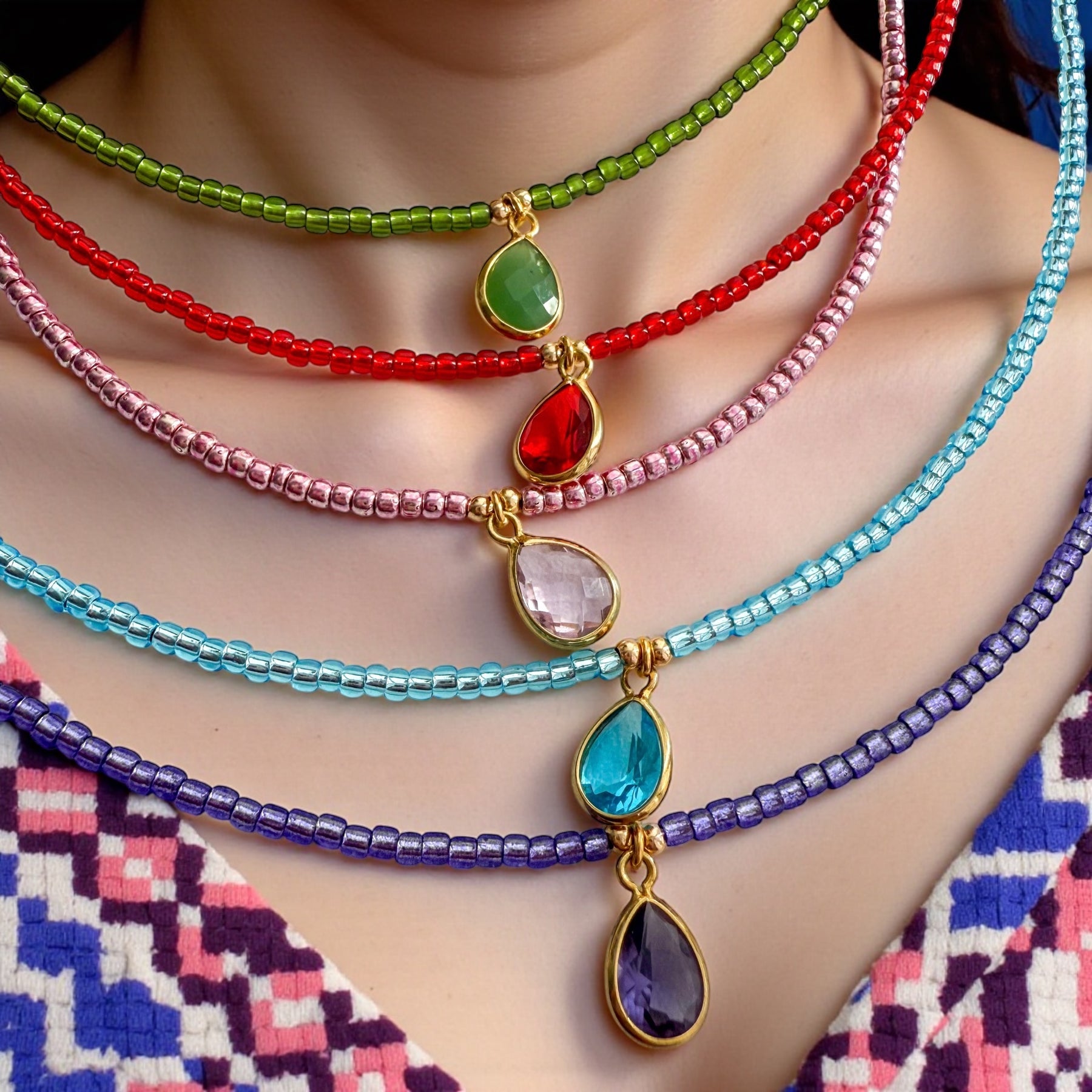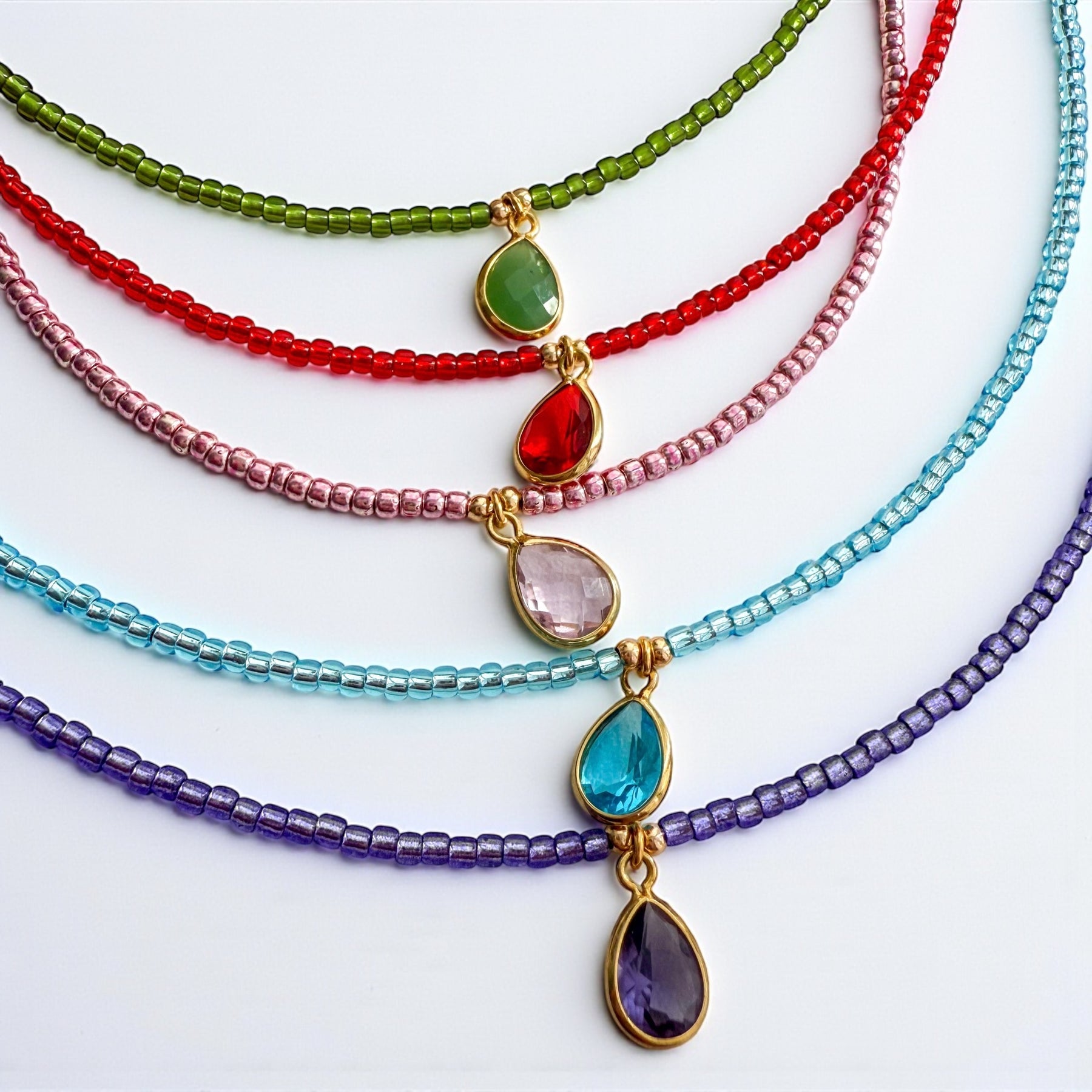 This handmade seed bead necklace features a beautiful 5-color mix, finished with 18K gold filled details and delicate crystal drops for an elevated, playful look.