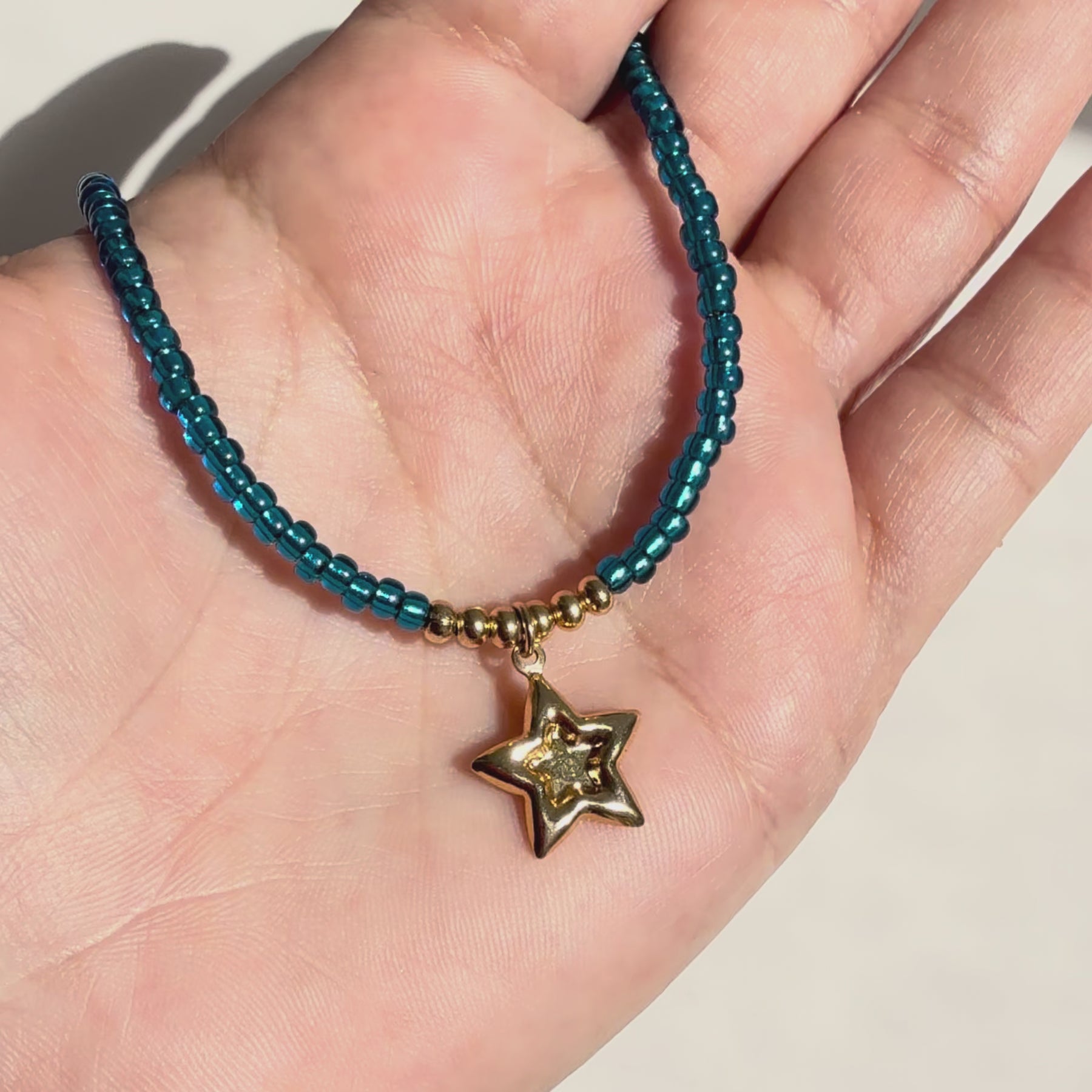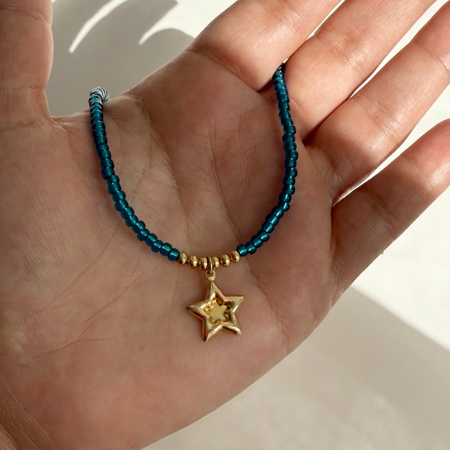 Handmade beaded necklace 14 inch chain with a 2 inch extension made of beads and 18k gold filled details.