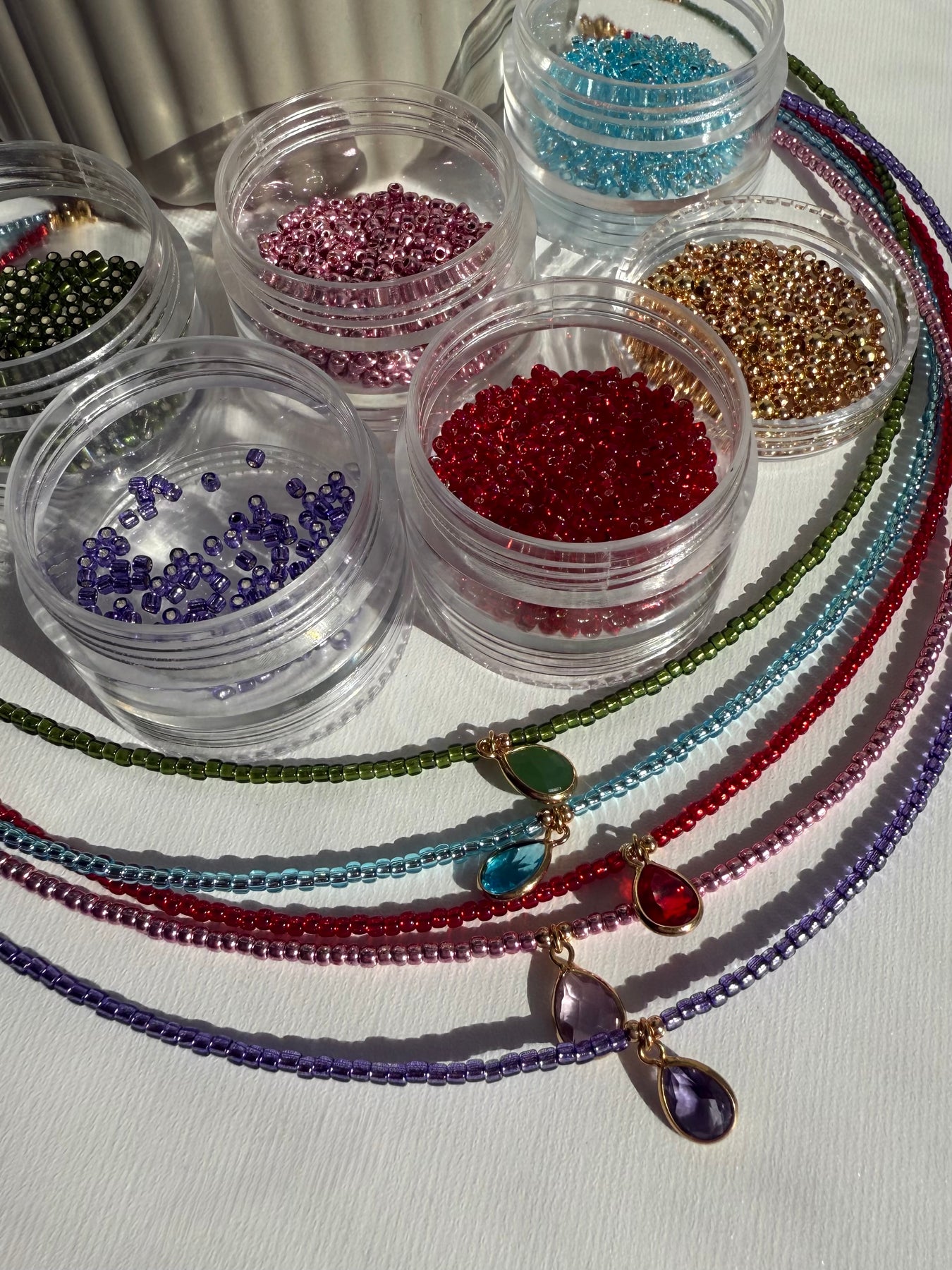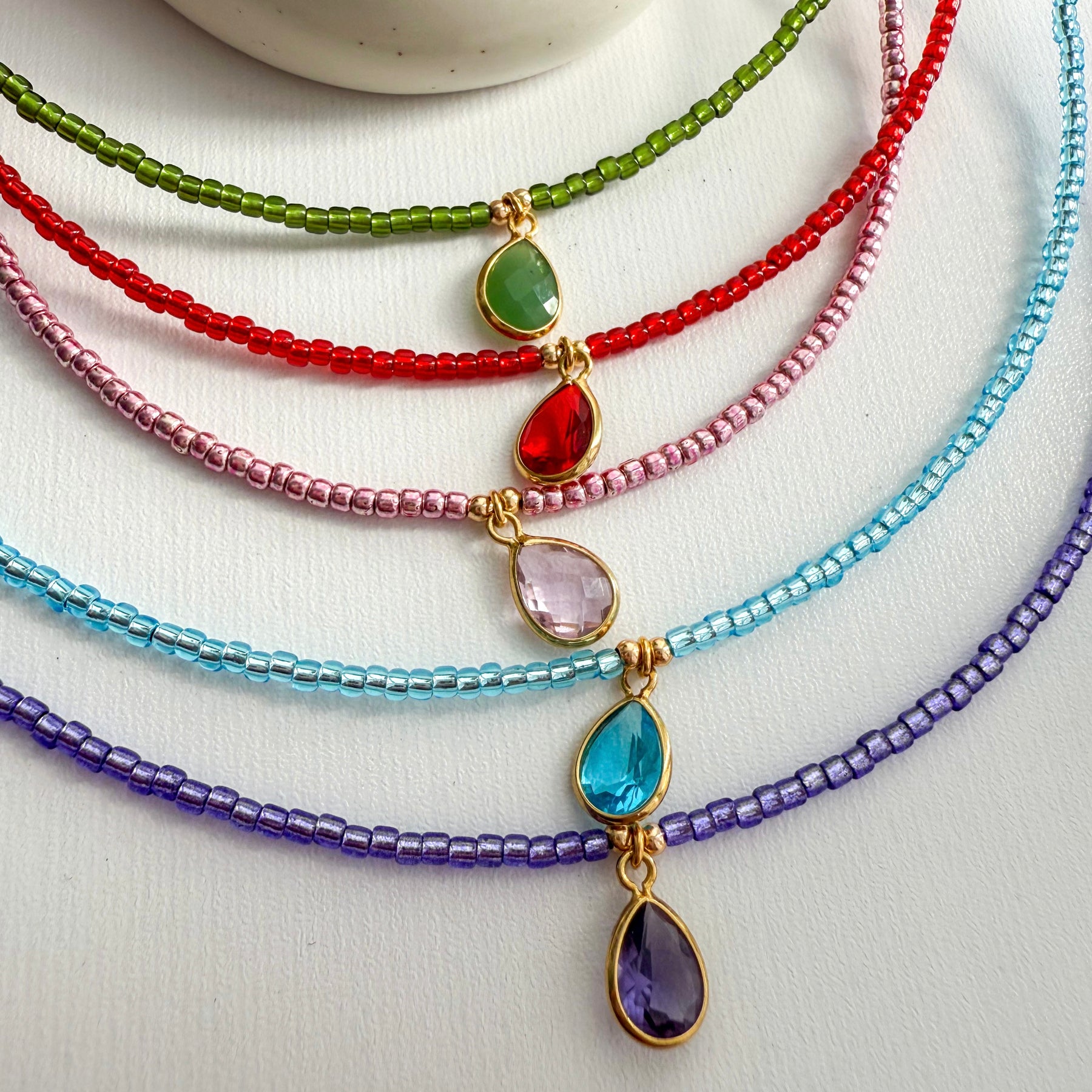 This handmade seed bead necklace features a beautiful 5-color mix, finished with 18K gold filled details and delicate crystal drops for an elevated, playful look.