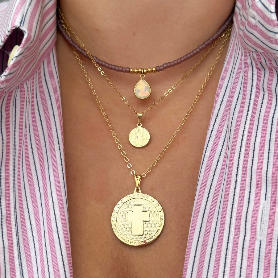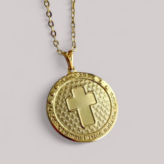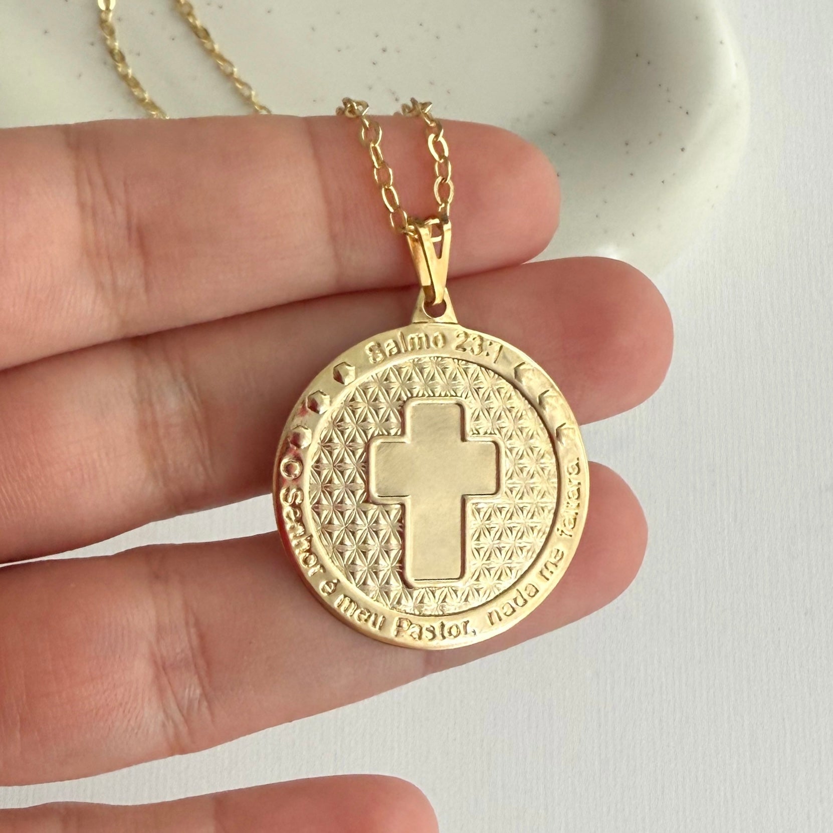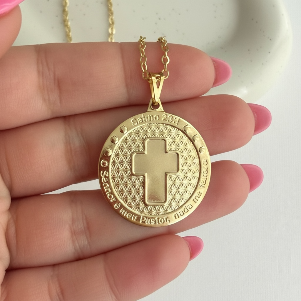 Carry faith and protection close to your heart with this elegant “El Señor es mi pastor” round charm necklace. Crafted in premium 18K gold-filled for long-lasting shine, it features a delicate engraved scripture and a classic cross — a meaningful reminder of guidance, hope, and divine love.