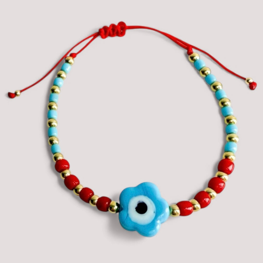 Add a pop of color and meaning to your wrist with this handmade adjustable bracelet. Featuring a vibrant red cord, blue glass evil eye charm for protection, colorful seed beads, and a delicate glass pearl accent.