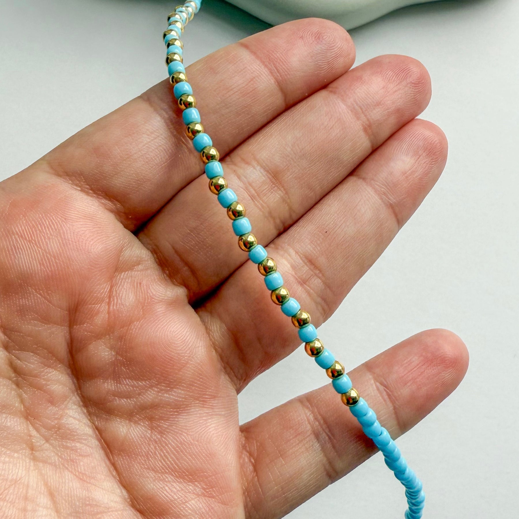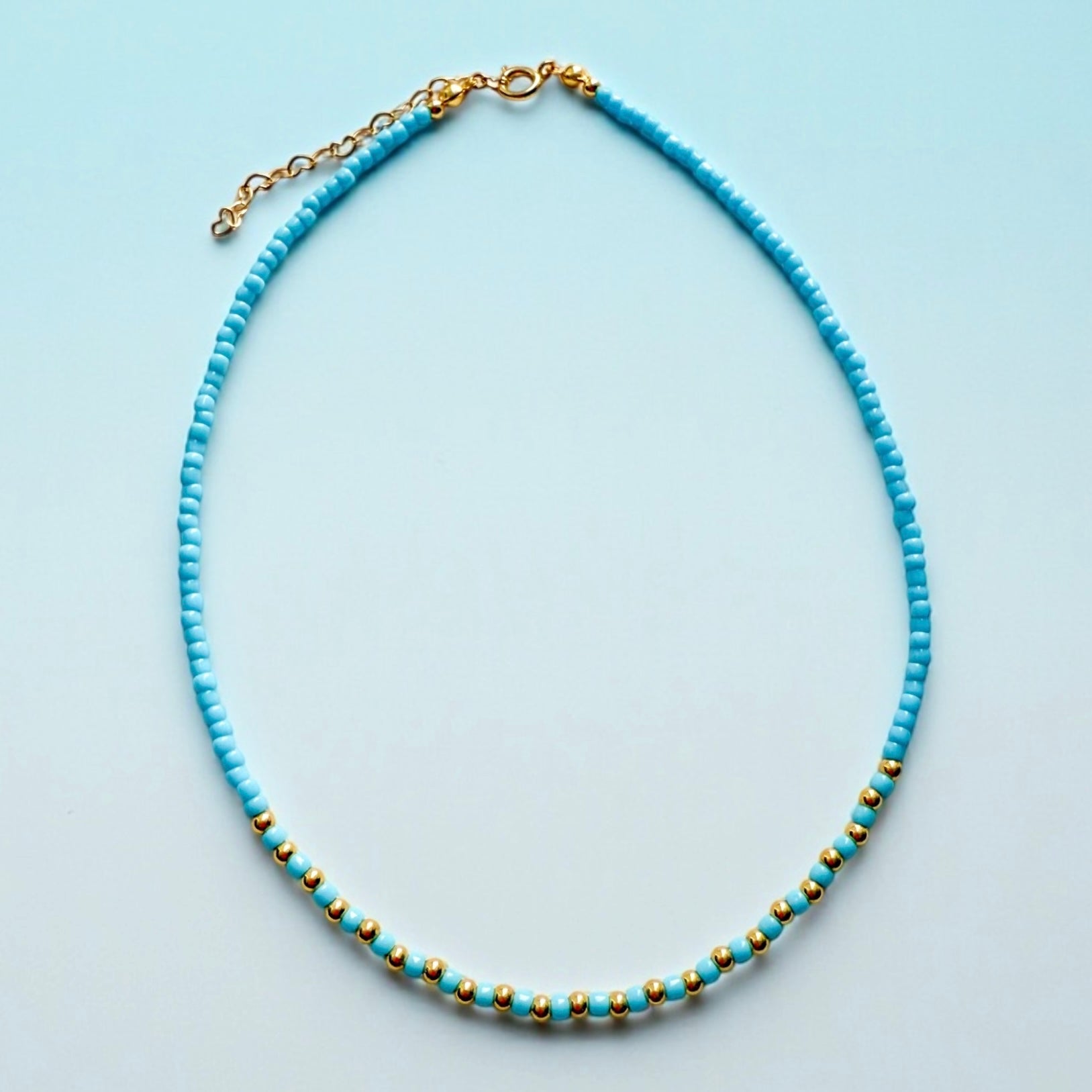 Handmade beaded necklace 14 inch with a 2 inch extension made of beads and 18k gold filled details.