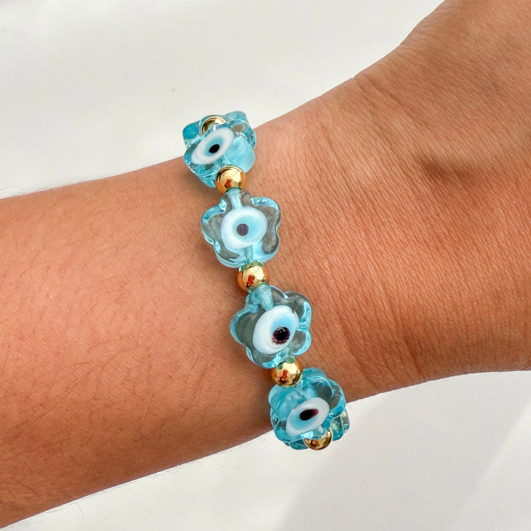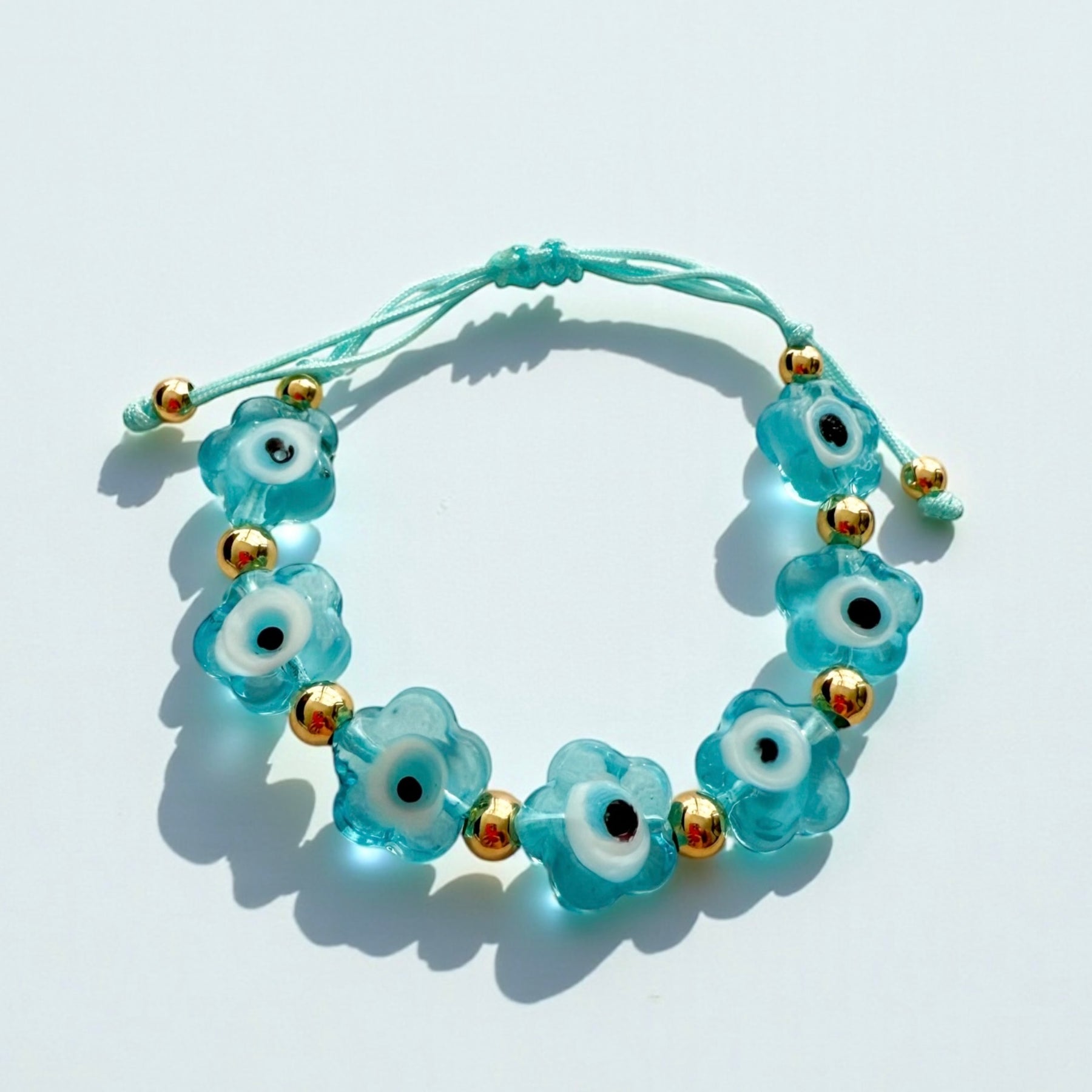 Add a pop of color and meaning to your wrist with this handmade adjustable bracelet. Featuring a vibrant red cord, blue glass flower charms, 18k gold filled spacer beads, and a delicate glass accent.