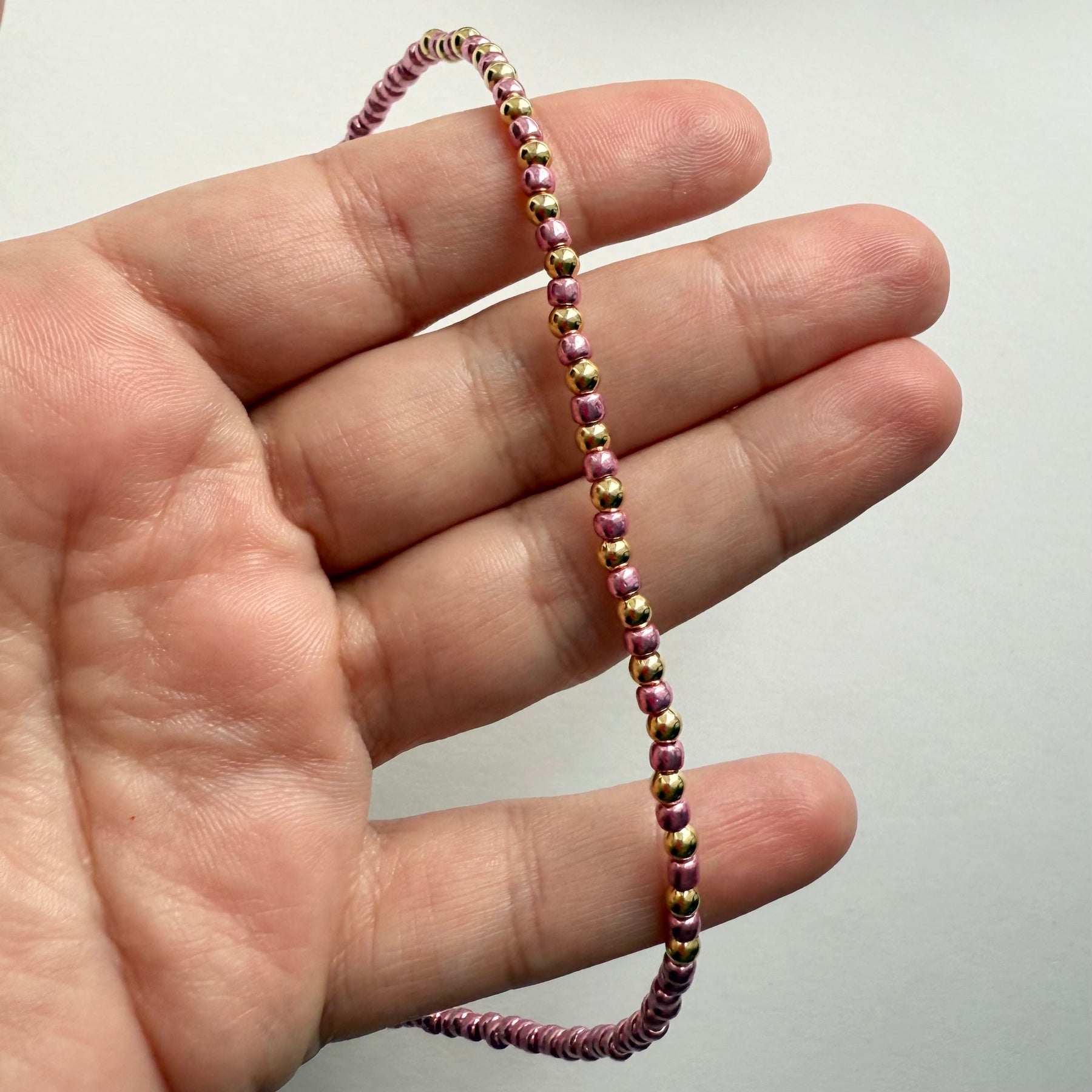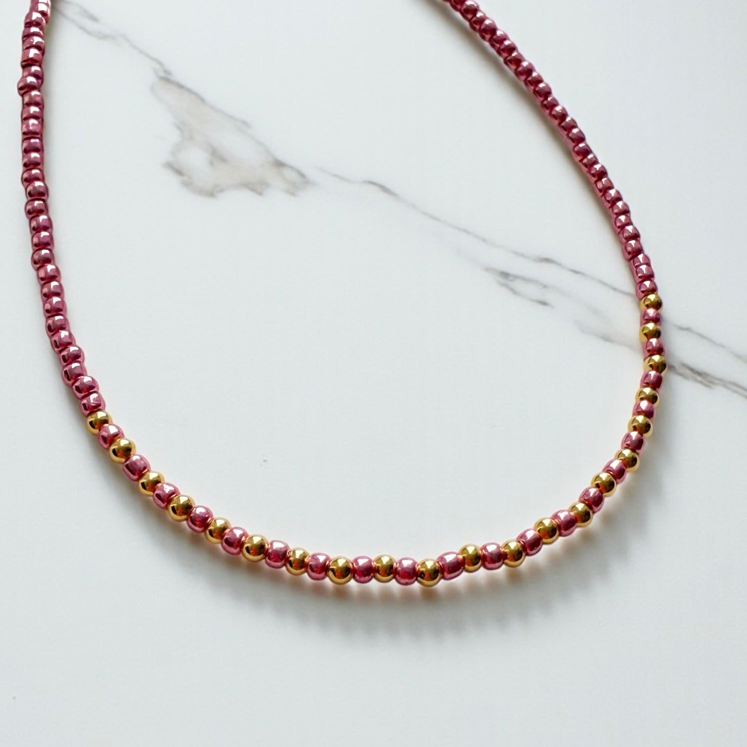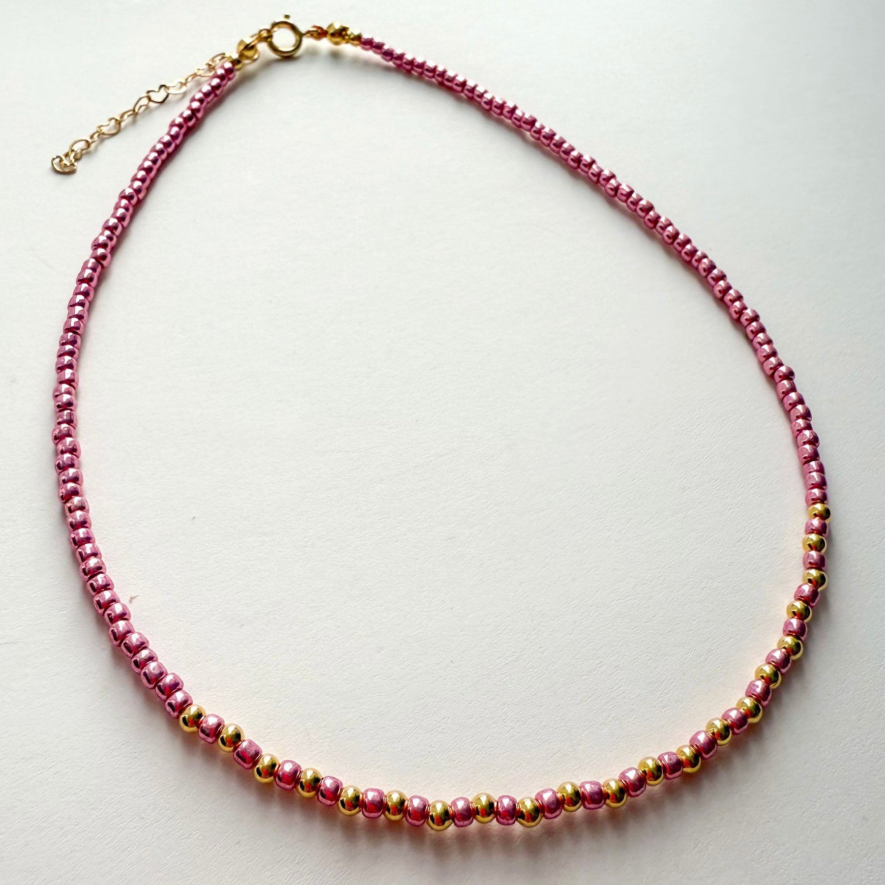 Shine with soft pink vibes ✨ Our Pink Metallic Beaded Necklace is handmade with love, featuring high-quality 18K gold filled spacers that won’t tarnish. The perfect mix of elegance and fun, ideal for layering or wearing solo.