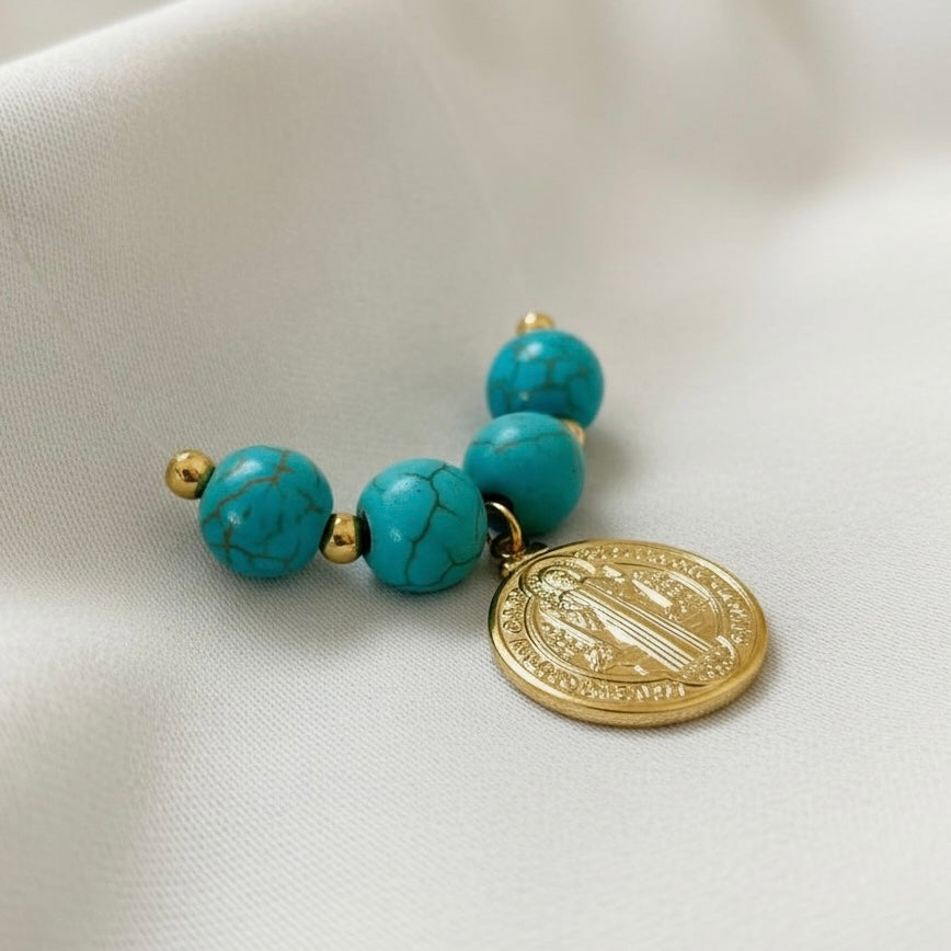 Discover the elegance of this San Benito necklace featuring a transparent medal and delicate blue round beads. Crafted with 18k gold filled, non-tarnish details, this adjustable necklace (14”+2”) offers a perfect fit for any occasion.